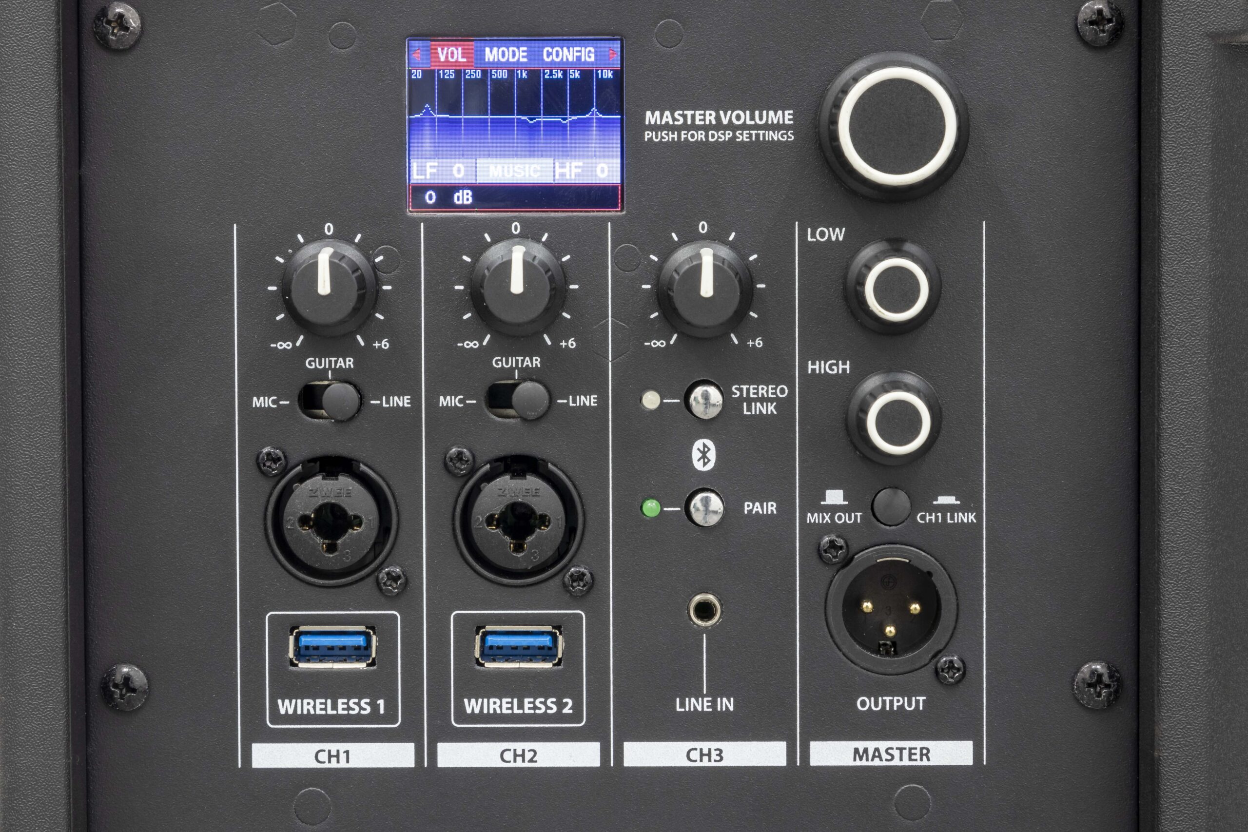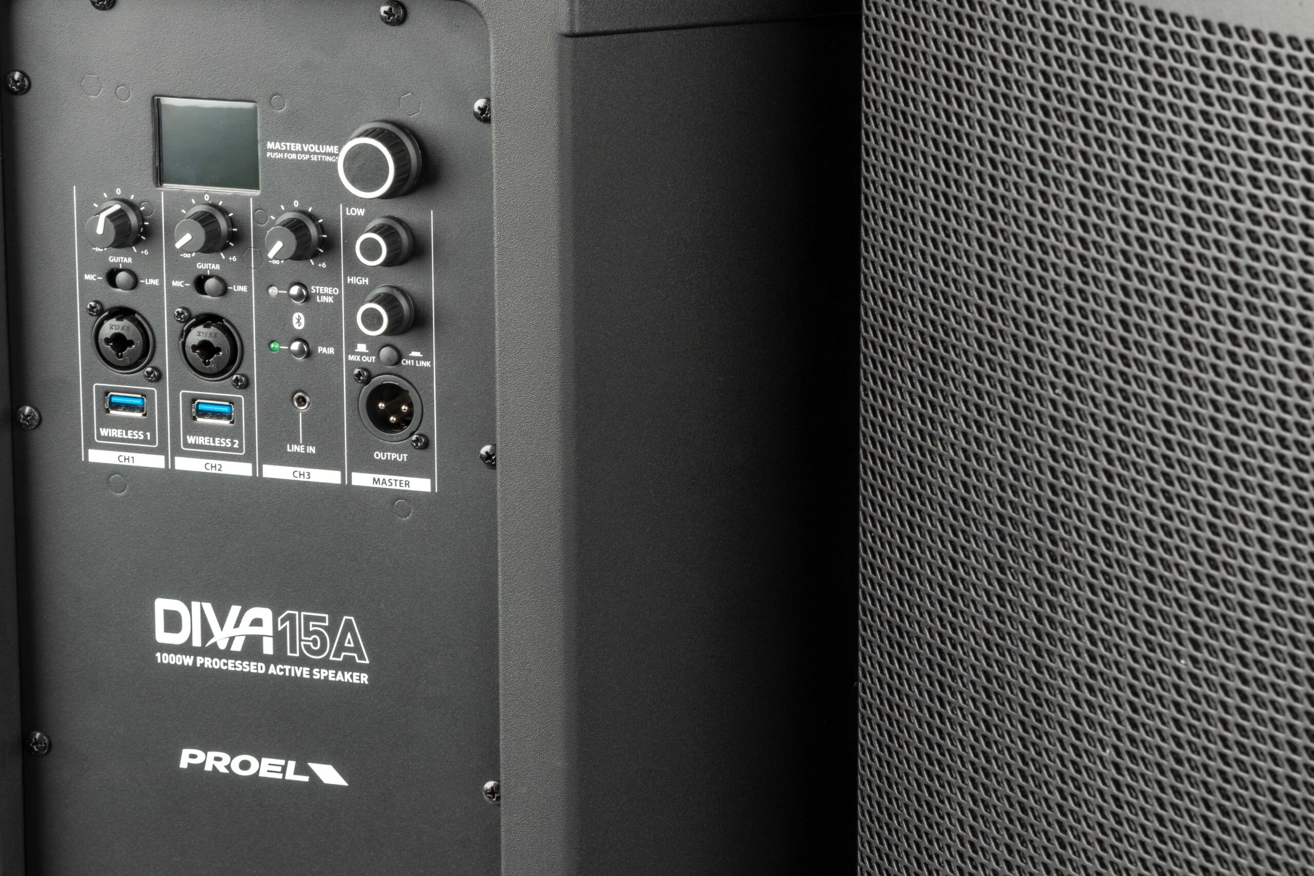 La sofisticata sezione del preamplificatore include un’elaborazione avanzata con processore DSP ad alte prestazioni e filtri FIR a fase lineare per una risposta lineare e un suono ad alta definizione. È disponibile un’interfaccia utente con display LCD a colori e un controllo a manopola singola per una rapida selezione e visualizzazione dei 5 preset EQ disponibili. Grazie al mixer a 3 canali integrato con selezione ingresso MIC / GUITAR / LINE, controlli HIGH e LOW EQ e due ingressi USB WIRELESS per l’utilizzo di sistemi microfonici PROEL U24, DIVA12A e DIVA15A possono essere utilizzati in una varietà di applicazioni senza apparecchiature esterne.