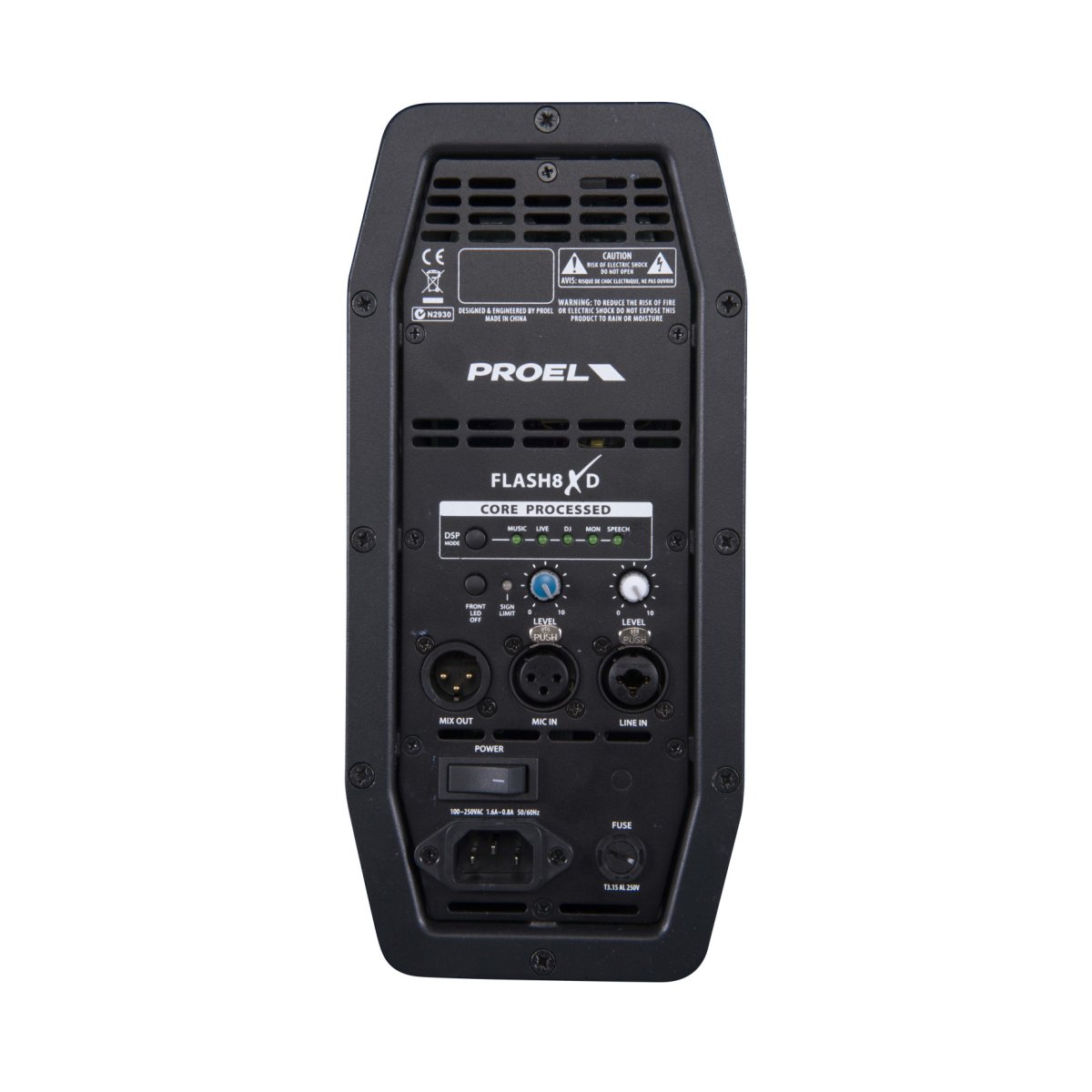 Con FLASH X PROEL introduce la terza generazione di una serie di diffusori che da anni rappresenta un riferimento per i sistemi compatti e portatili. I nuovi diffusori FLASH8XD e FLASH12XD proseguono una lunga storia di suoni ad alta definizione, affidabilità e robustezza in un formato conveniente, aggiungendo importanti miglioramenti nella tecnologia ed uno stile completamente nuovo, e offrendo di nuovo il massimo in prestazioni, funzionalità e design.FLASH XD sono alimentati da amplificatori di nuova concezione in grado di fornire fino a 1000W o 600W di potenza pulita e non distorta. Gli stadi di uscita in classe D ad alta efficienza, combinati con un alimentatore SMPS leggero e compatto, forniscono a FLASH XD una notevole ‘spinta’ ed una riserva di potenza costante. Il mixer a 2 canali integrato con ingressi LINE e MIC indipendenti può trasformare istantaneamente qualsiasi FLASH XD in un sistema PA.L’uso di altoparlanti accuratamente selezionati e personalizzati, inclusi i driver a compressione ad alta definizione e i woofer a lunga escursione, forniscono una risposta acustica accurata ed un incredibile livello di pressione sonora con distorsioni molto basse.FLASH XD sono controllati dal potente PROEL CORE LT DSP, con un’elaborazione del segnalie ad elevate prestazioni e con convertitori a 24 bit ad alta definizione, in grado di offrire una definizione sonora eccezionale e una performance dinamica tipica dei sistemi top-end. L’elaborazione del segnale CORE DSP include un sofisticato EQ dinamico, in grado di processare con precisione il suono del sistema mantenendo una gamma dinamica completa a qualsiasi livello. Inoltre, il sistema CORE LT DSP offre un’ampia protezione dinamica al sistema per ottenere sempre la massima potenza in uscita. 5 EQ PRESETS (MUSIC, LIVE, DJ, SPEECH, MONITOR) possono essere facilmente selezionati per adattare gli altoparlanti a qualsiasi tipo di applicazione.Caratteristiche comuni di FLASH X sono i cabinet in PP leggeri e compatti con esteso sistema di nervature interne e profilo trapezoidale, le trombe per le frequenze alte ad ampio angolo di copertura costante (90°x60°) per una diffusione uniforme del suono, le maniglie in alluminio ergonomiche di nuova concezione ed i punti di sospensione per l’installazione fissa.