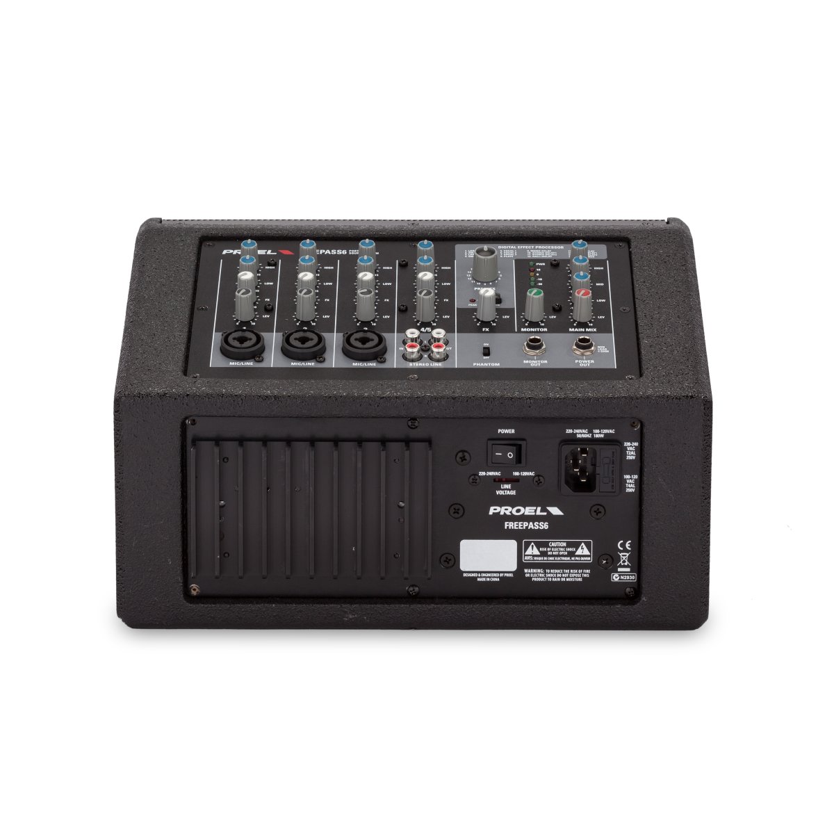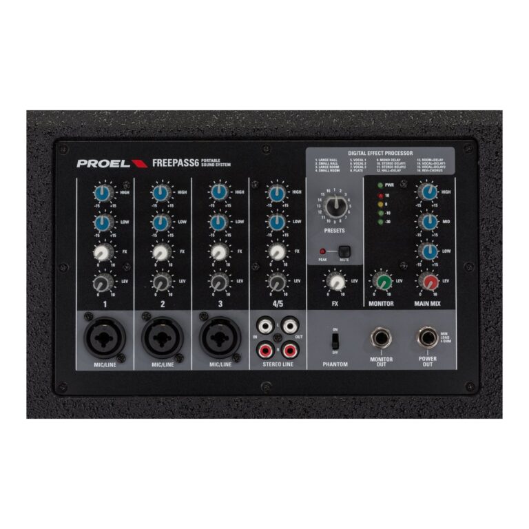 FREEPASS6 è un sistema audio combinato formato da un diffusore, un amplificatore ed un mixer da 5 canali in un formato ultra compatto e portatile.Il diffusore a due vie utilizza un tweeter al neodimio da 1” ed un woofer da 6.5”, in grado di fornire una risposta in frequenza estesa e dettagliata.L’amplificatore incorporato eroga agli altoparlanti 75 W di potenza RMS e, grazie ad un connettore POWER OUT, è in grado di alimentare anche un secondo diff usore.Il sistema include un mixer a 5 canali di elevata qualità, con EQ di canale a 2 bande, EQ per il MAIN MIX a 3 bande, uscita MONITOR e un sofisticato EFFETTO DIGITALE a 16 presets.FREEPASS6 è alloggiato in un cabinet in MDF robusto e compatto, rifinito con una resistente vernice anti-graffio, che assicura la massima portabilità e protezione per ogni tipo di utilizzo. Due inserti filettati M4 sul fondo e su un fianco del cabinet consentono l’applicazione di un adattatore metallico fornito di serie per l’installazione del sistema su supporto standard per diffusori, in posizione sia verticale che orizzontale.FREEPASS6 è un sistema di completo ultra-compatto ed estremamente conveniente per musicisti live, diffusione vocale ed eventi al chiuso di tipo religioso, sportivo o commerciale. I 5 ingressi disponibili nel mixer incorporato consentono di collegare una grande varietà di segnali, mentre la possibilità di raddoppiare la potenza collegando un secondo diffusore rende possibile utilizzare il sistema anche in applicazione.