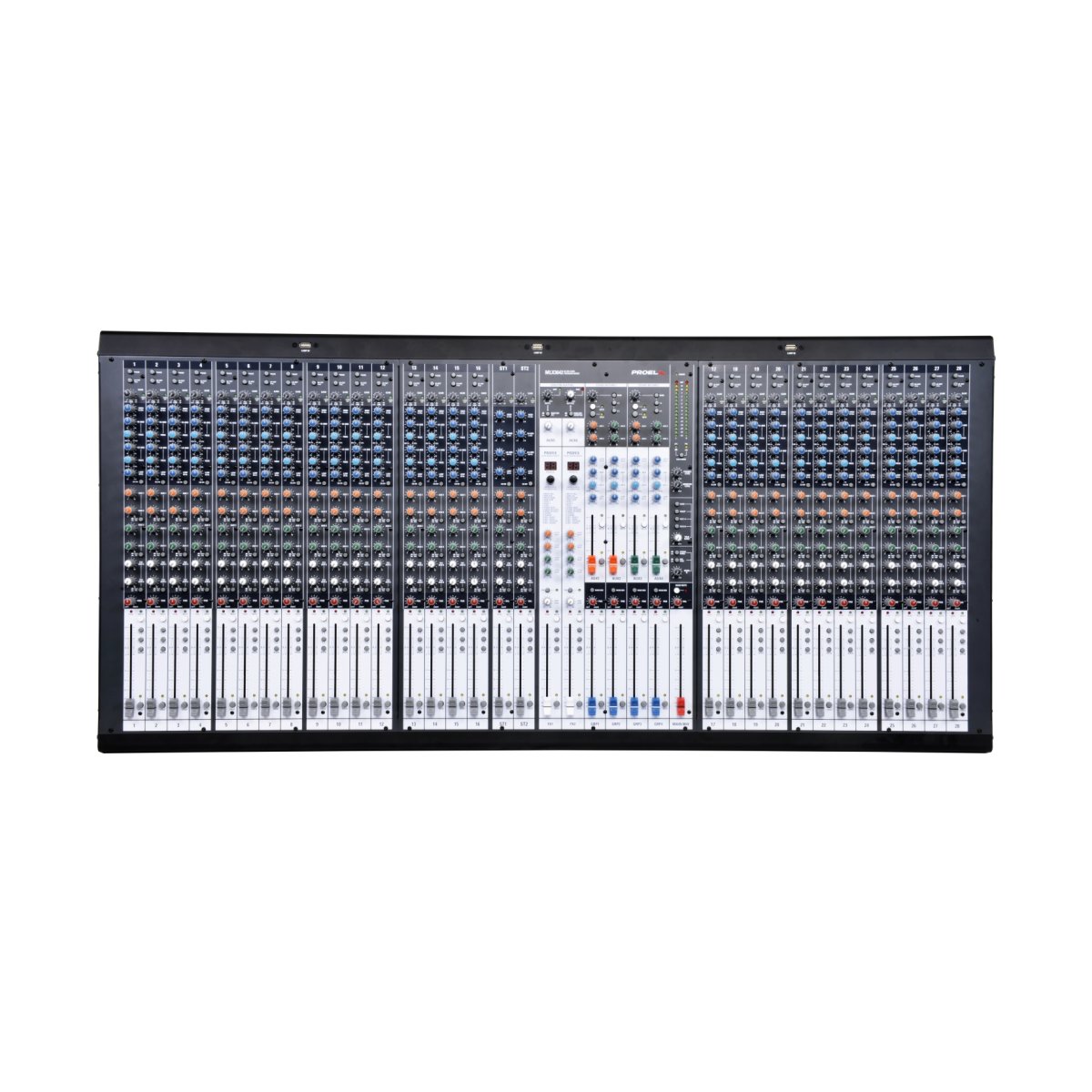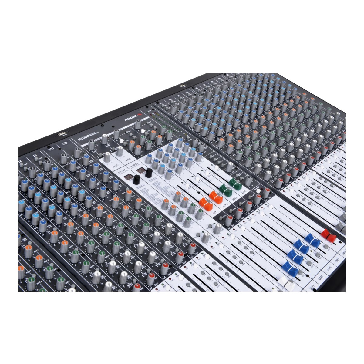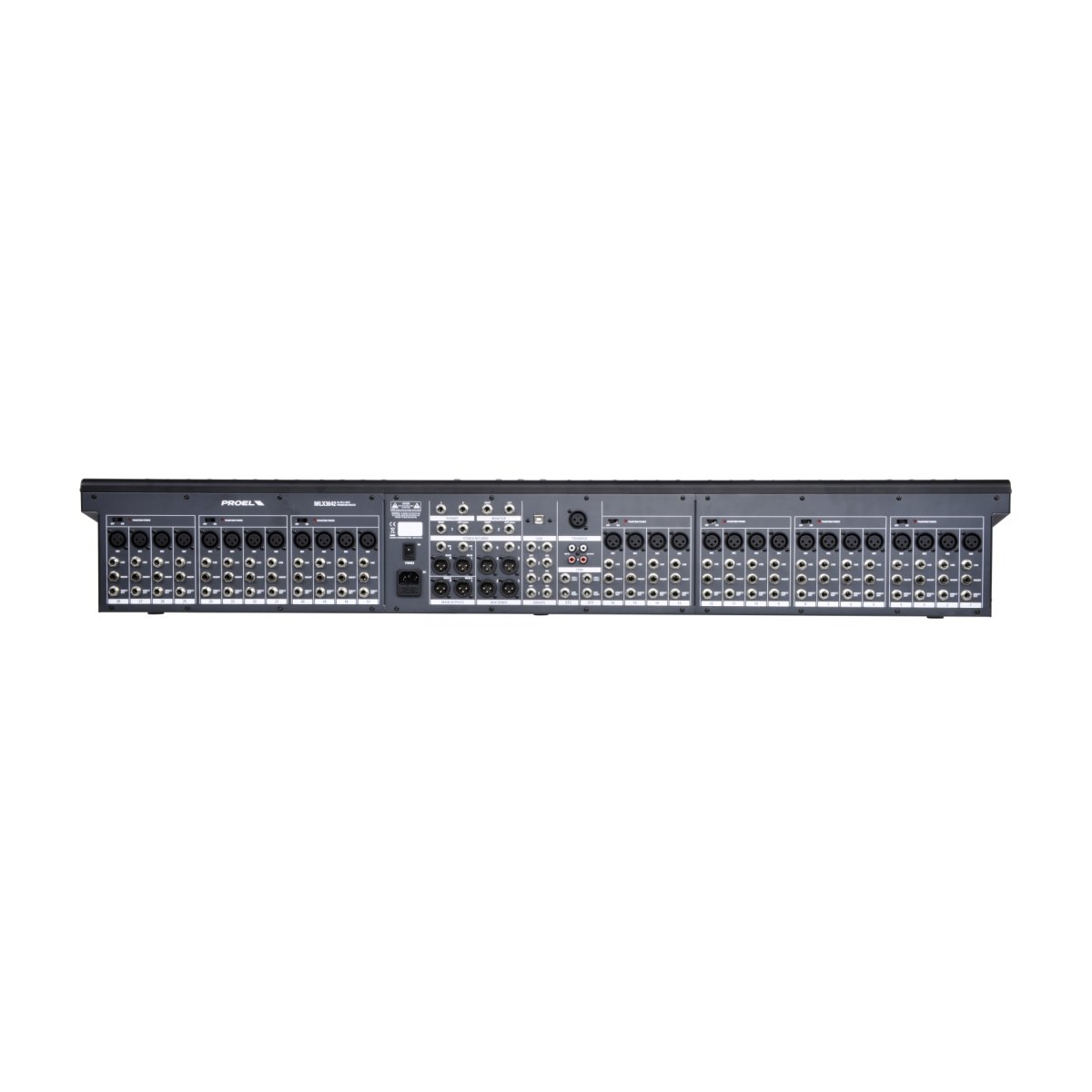 MLX3642 is a large format mixer combining a large number of channels with a full set of features designed to fit any professional sound reinforcement application.The 28 MONO input channels feature ultra-low noise, high-headroom preamps, able to capture the full range of any instrument. The 4-band EQ with two sweep mids has a great response for tweaking your sound in the most musical way, while the EQ ON/OFF switch allows instant comparison. Each model includes two STEREO channels with 4-band EQ. The 6 AUX sends can be set pre- or post-fader in pairs. AUX sends 1 to 4, with 60mm faders and 3-band EQ, provide effective control of the stage monitoring. AUX sends 5&6 can be routed to the two internal effects, to external outboard or used as two additional monitor sends. Two STEREO RETURNS with full routing allow to connect external outboard or two additional stereo instruments.All the channels together with the four GROUPS and the MAIN MIX feature 100mm long-wearing high-quality faders for the most accurate level control.The MLX mixers include two 24-bit PROFEX digital effects able to provide 256 studio-grade gig-ready effect algorithms: this allows to enhance your mix with natural high-resolution reverb or delay effects without the need of external outboard. The effects can be selected thru a convenient LCD display and they can be freely routed to the monitor sends, the groups and the main mix.The MLX series features a built-in USB interface to get CD quality audio to and from your computer: thru the USB interface you can play audio files from the PC or record your live performance directly on hard-disk. The MLX USB interface offers the possibility to route the INPUT signal directly to the MAIN MIX or to STEREO channel 2 and to get the OUTPUT signal from the MAIN MIX or from GROUPS 1&2.The MLX MASTER section offers plenty of services and useful features, such as a MAIN MUTE switch, a TALKBACK section and separate PHONES and MONITOR level controls. Three USB sockets are available for connecting 5V USB LAMPS.The intuitive control surface layout and the color-coded ergonomic knobs of MLX mixers allow to locate easily each function and makes them extremely easy to use. Both models are hosted in a rugged and road-proof metal chassis.