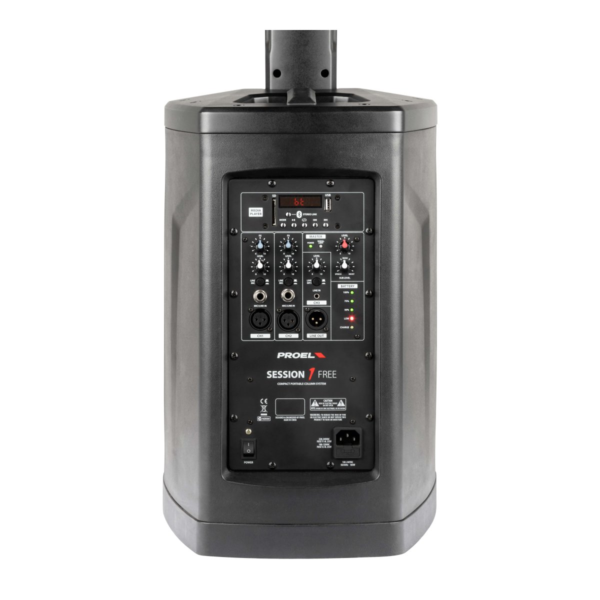 SESSION1FREE è un sistema a colonna portatile dotato di ingressi multipli e di un versatile lettore MP3 con connettività BLUETOOTH. Ospitato in cabinet in polipropilene leggero ma ultra resistente, è composto da una colonna con quattro altoparlanti full-range da 2,5” ad alta definizione e un potente subwoofer da 8”. L’elettronica all’avanguardia include una sofisticata sezione di preamplificazione con filtro attivo e doppi CLIP LIMITER e un potente amplificatore di potenza in Classe D da 400 W a 2 canali. La batteria agli ioni di litio integrata garantisce fino a 8 ore di funzionamento continuo senza alimentazione di rete, per la massima libertà di utilizzo.